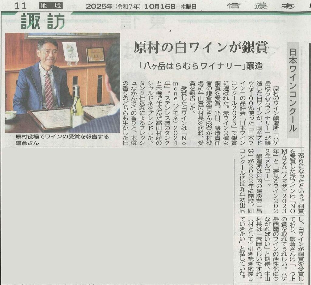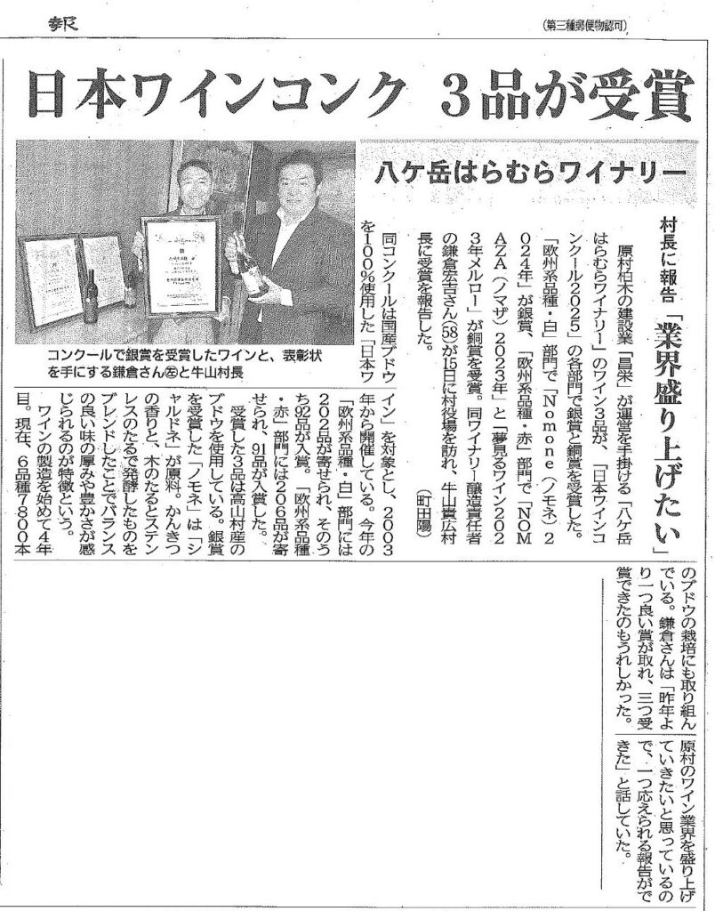弊社醸造のワインが「日本ワインコンクール2025」で銀賞・銅賞を受賞 2025年10月16日 by herohero 「日本ワインコンクール2025」で、弊社ワイン醸造所 八ヶ岳はらむらワイナリーの白ワイン「Nomone(ノモネ)2024年」が銀賞を、赤ワイン「NOMAZA(ノマザ)2023年」と「夢見るワイン2023年メルロー」が銅賞を受賞しました。 信濃毎日新聞 2025.10.16 11面 長野日報 2025.10.16 3面 八ヶ岳はらむらワイナリー